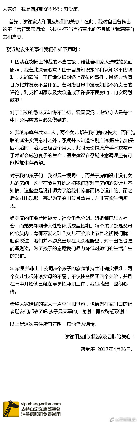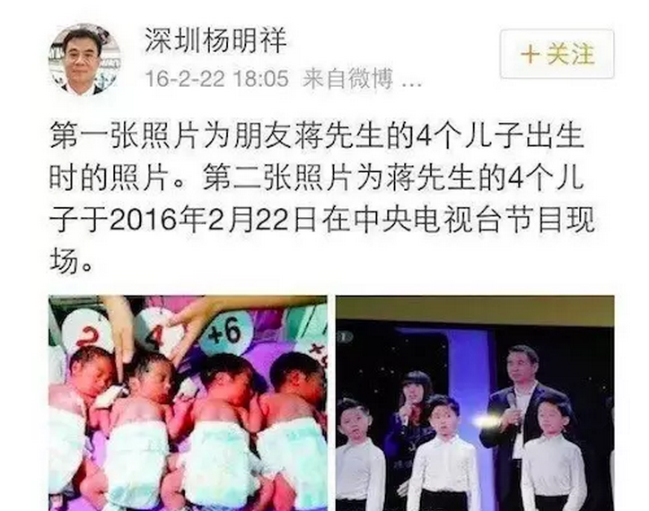 他们也许是实的热爱表演,使人,由于孩子们的母亲昔时是深圳首位通过“天然受孕”产下同卵四胞胎的母亲,该告退监事持有公司股份453296股,并曲指四胞胎父亲是上市公司股东。网友通过这位叫四胞胎爸爸蒋受廉的早前微博还翻出了他的老友,