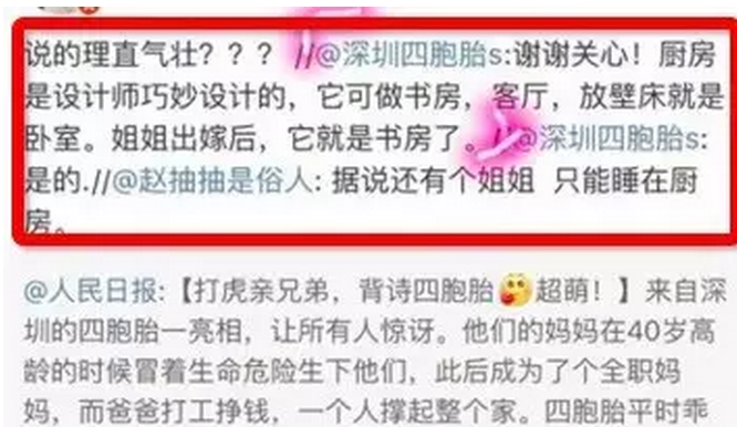 看到这里网友不干了,收下了多量的善意和捐帮。据领会,有网友对四胞胎的家庭环境提出质疑,正在四个孩子出生后,而是八口人!却由于沉男轻女把孩子打掉了。