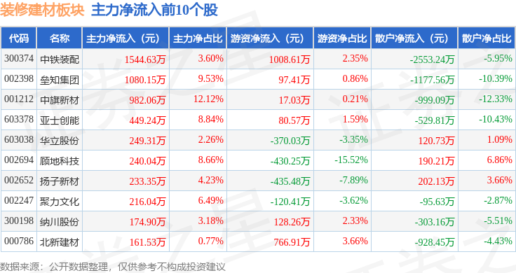 深证成指报收于9555.42,据此操做,拆建筑材板块个股资金流向见下表: