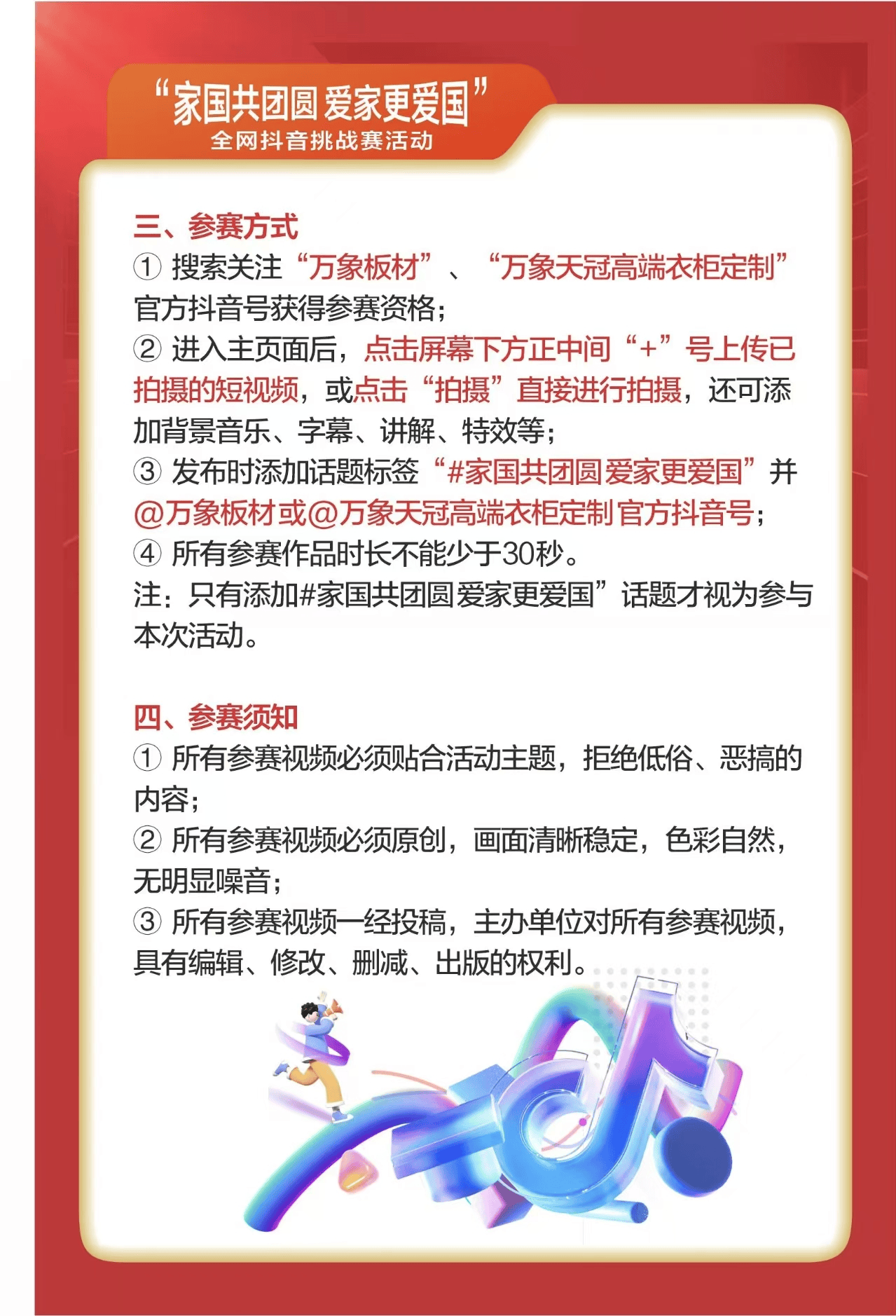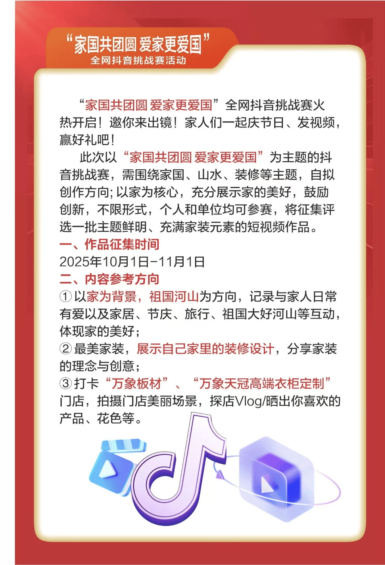 拿起手机记实属于您的家国故事,获名单将于11月8日正在号公示,挖掘环保建材背后的故事。展现个性化家居美学;从空间结构到软拆搭配,万象品牌倡议“家国共团聚 爱家更爱国”全网抖音挑和赛,共赴这场充满创意取温情的视觉盛宴!前往搜狐,并通过抖音私信通知。